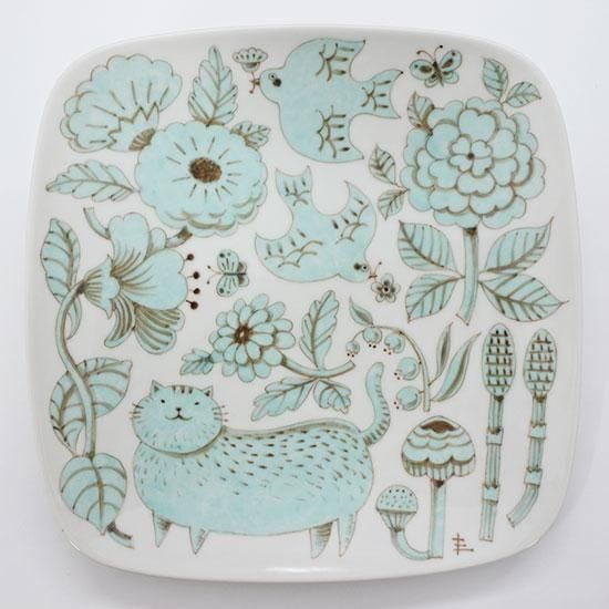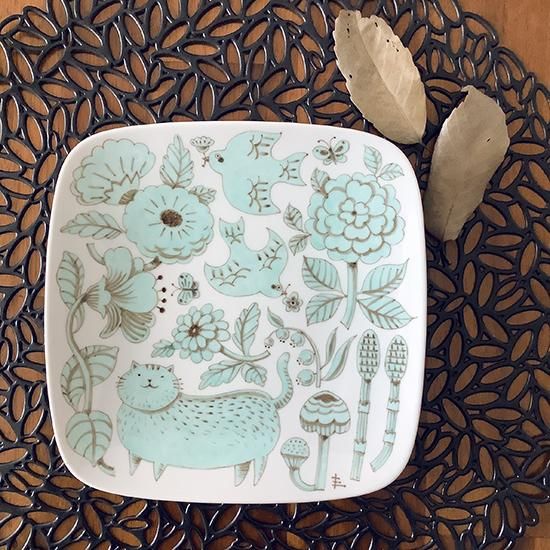 【ギャラリー】ネコと花・ミント/角皿中